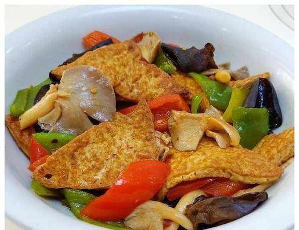 3.豆腐油稍微炸一下,让汁水不干,可以撒适量的水,最后撒少许盐,倒入淀粉水炒至顺滑即可。可以把它从锅里拿出来。