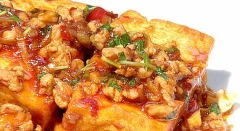 原料:豆腐250克,花生米1把,蒜末,花生油,糖,醋,酱油,料酒,盐,湿淀粉,鸡汤,芝麻。