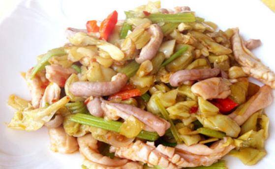 3、加入酸菜炒至干,加入糖继续,这样酸菜可以充分吸收糖的味道,不会太酸;4、倒入五花肉翻炒,加入老抽,上色入味后捞出。