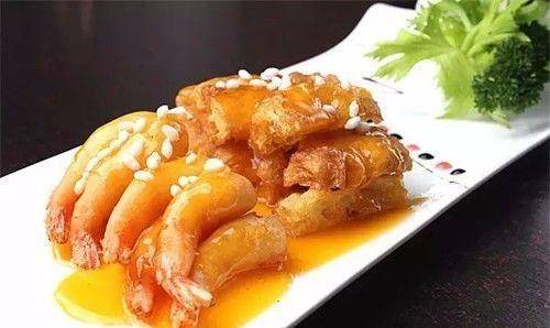 2.将调味好的青虾均匀地裹上酥皮酱,下油锅炸熟,捞出放在另一面的盘子里。