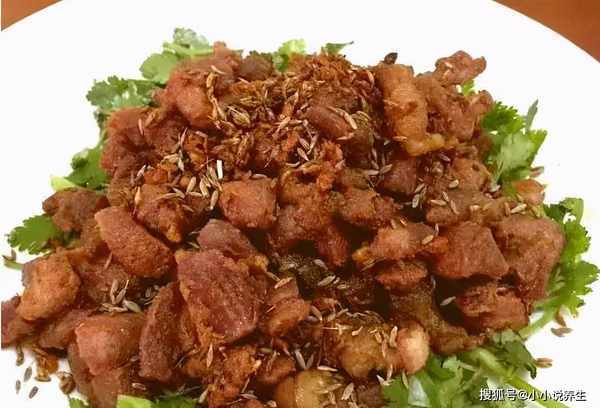 2.将干五花肉放入70%的热油中炸1分钟至焦黄。