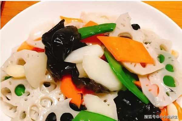 1、莲藕去蒂,洗净切片,浸冷水,胡萝卜去皮,洗净切片,香菇去蒂,豌豆去筋,洗净备用。