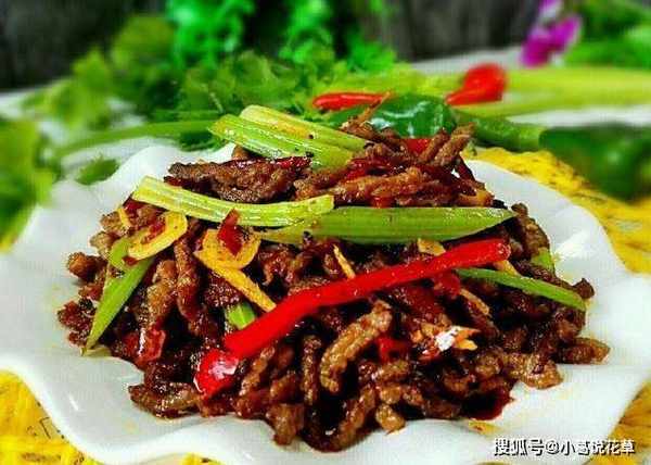 ②锅置火上,油烧热,放入腌好的牛肉丝,翻炒至牛肉呈深红色,加入豆沙继续翻炒。如果香气扑鼻,加入芹菜、糖、盐用味精翻炒,关火,装盘,撒上花椒粉。