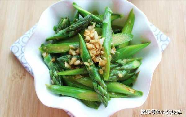 材料:芦笋400克,大蒜4瓣,盐、糖少许
