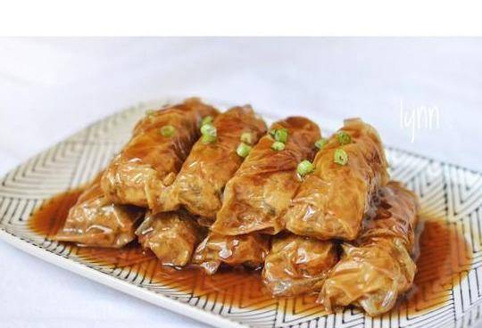 3、将炸好的豆皮卷全部倒回锅内,加水没过锅盖,加入适量老抽、盐、糖,烧开,开锅盖,大火收汁。当汤剩下1/3时,在上面撒一点。如果你喜欢1/3多汁,你可以把它从锅里拿出来,我们都喜欢它有点干。煮的时候不要怕它散架,因为炸好的烂皮不容易烂,而且已经凝固了。