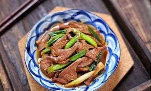 原料:牛肝、油、盐、酱油、黄酒、生粉、蒜苗、青椒、姜
