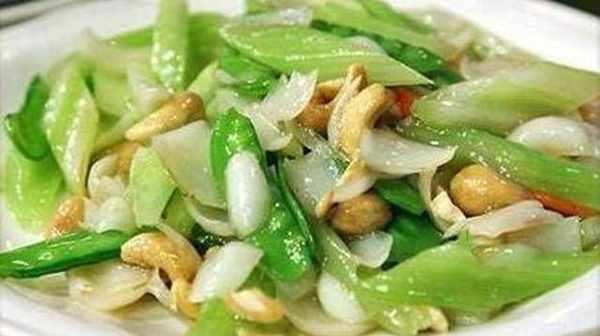 原料:芹菜200克,腰果20克,百合1个,胡萝卜适量,盐适量,白糖适量,水淀粉适量,香油适量