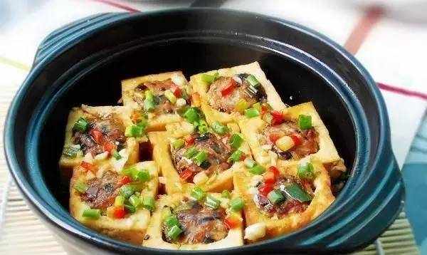 配料表:北豆腐、干香菇、牛肉碎、葱、蒜、盐、油、胡椒粉、料酒、生抽、蚝油、水淀粉、红辣椒丁