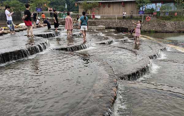 前往人工打造的“网红河”,河水流过一层一层半圆形的阶梯,形成若干个小瀑布。从现场情况来看,有洁癖的小伙伴们尽量不要下河,淤泥和漂浮物随处可见,河水浑浊不堪,不是一个夏季玩水的好去处。
