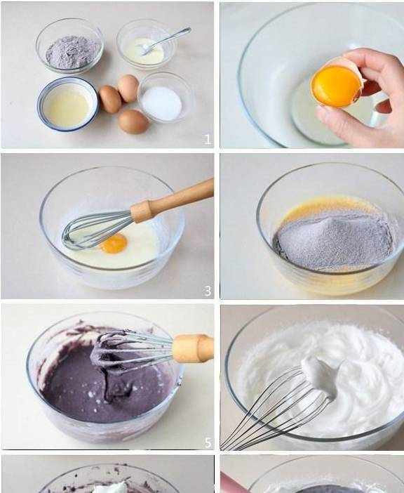 做法:1、准备所需食材;2、鸡蛋蛋清蛋白分离,装蛋清的盆要干净无油无水;3、色拉油、牛奶混合,搅打均匀,蛋黄分次加入搅拌均匀;4、黑米分次过筛筛到蛋糊里,Z字形拌均匀;5、最后的面糊是称浓稠的糊状;6、细糖分次加蛋白打发,打到提起打蛋器有尖峰时即可;7、分3/1蛋白加入到米糊里,用翻拌的方式拌均匀;8、拌好的蛋糊倒入剩下的蛋白霜里,用同样的手法再次拌均匀;