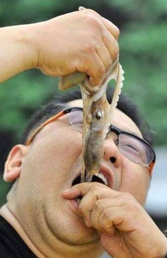 生吃八爪鱼。以前看电视觉得他们吃得还挺过瘾的,但是到了外国吃的时候...是生吃的!对,开始你根本没法下嘴,只能闭着眼睛吃下去,到了嘴里八爪鱼的吸盘就会吸你的嘴!瞬间有种舌吻的感觉,绝对重口味!