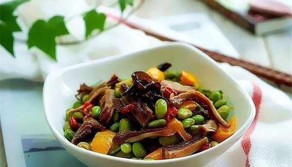 8、第二锅烧六分钟,加几滴油,油不要太多,倒入毛豆翻炒1分钟,因为毛豆已经焯水了。