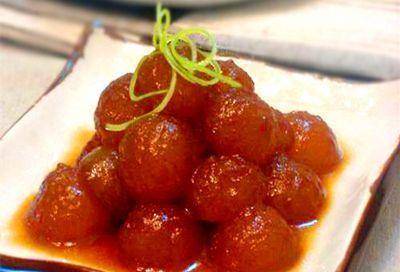 原料:牛柳300克,大葱50克,盐、糖、肉粉、番茄汁、橙汁、柠檬汁、柚子汁、酸梅、料酒适量。