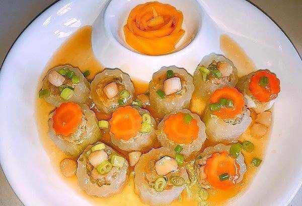 7.取胡萝卜,用小模具压出小花(装饰用)。将肉馅交替填入准备好的蜡南瓜中。8.然后把泡好的带子放在肉馅上。将冬瓜放入模具中,加入胡萝卜花,准备隔水蒸熟。