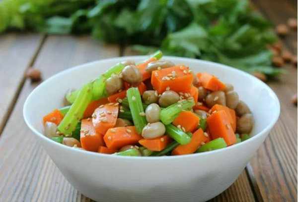 6、将煮好的花生米、焯好的芹菜和胡萝卜放入,加入盐、蔬果粉、香油、白芝麻搅拌至顺滑。