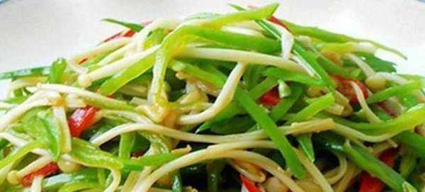 做法:1、荷兰豆洗净,去筋切丝;金针菇切根洗净,红辣椒切片,姜切片;