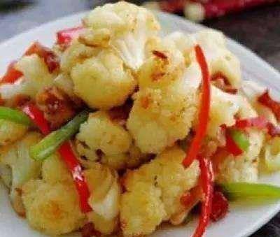 4、将花菜放入锅中,用大火不断炒至花菜熟透。