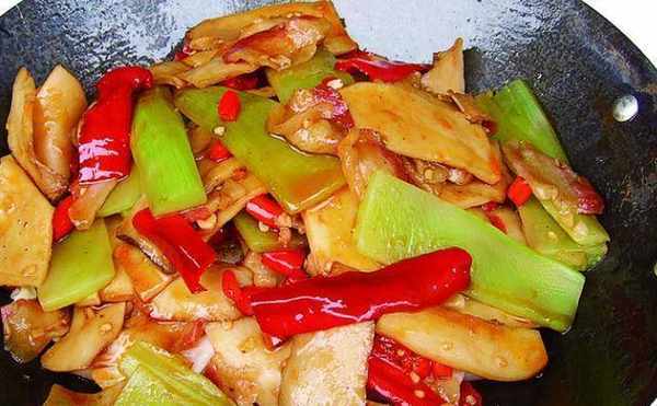5、加入肉丝翻炒8分钟,再加入干豆腐和榨菜翻炒3分钟。
