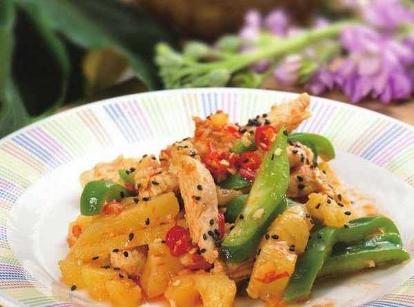 3.锅内烧热橄榄油,加入蒜茸和红辣椒爆香,再放入鸡肉片,炒至七次,加入鱼露、黑芝麻、糖醋酱油调味,下青菜。胡椒条、菠萝条炒熟,撒上葱末即可上桌。