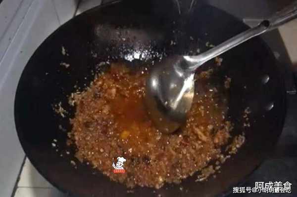 第三步:先将锅烧烧热,倒入适量的油滑锅,将油倒掉后再重新倒入少许菜籽油烧至四成热时加入猪油十克炒化,再将切好的牛肉末放入爆香,加入适量的豆瓣酱炒化炒出红油,再加入少许豆豉和泡椒、泡姜开中小火将辅料炒香炒出红油,再加入炒好切碎的辣椒五克翻炒均匀加入适量的清水。