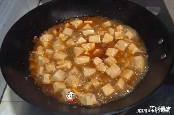 第四步:开大火烧开吼吼开始调味,加入食盐一克、味精一克、白糖一克提鲜、生抽一克调底色,然后再将焯好水的豆腐下入锅中,下锅后将豆腐烧3分钟(这一步主要是要将豆腐烧至入味),最后加入水淀粉勾芡,勾芡需要三次,第一次稍微稀一点,第二次要比第一次要稠一些、第三次更要稠一些,加入少许芝麻香油翻炒均匀即可出锅装盘,在盘中撒上一点花椒面和蒜苗碎即可上桌。