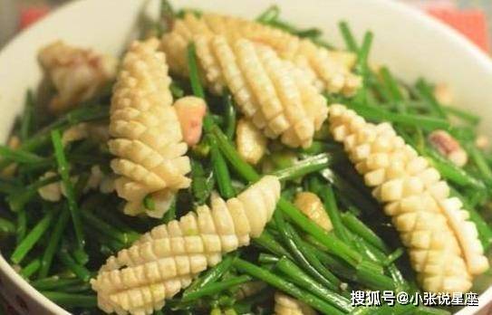 做法:1、章鱼洗净后,去除章鱼胃内容物,撕去章鱼外皮,切去头部眼部部分;用X型刀切章鱼花;然后切成三角形;用酱油腌制料酒备用;韭菜花洗净切段;