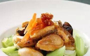 主要原料:新鲜大连鲍鱼头5个,芦笋100克,百合75克,芹菜150克,青红椒25克。