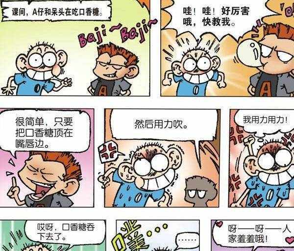 你看我的很自然的就吹得很大,但是呆头的就是吹不好,也一直在用力,还是吹不好,一不小心就给咽到肚子了,这可怎么是好,只能等下次再买的时候在学了,就在这个时候有人喊呆头老师叫你去办公室,于是呆头很有礼貌的跟A仔那我先走了,下次记得教我,说完呆头走向老师的办公室,转身走后可把A仔吓坏了,你的屁股竟然会吹泡泡。
