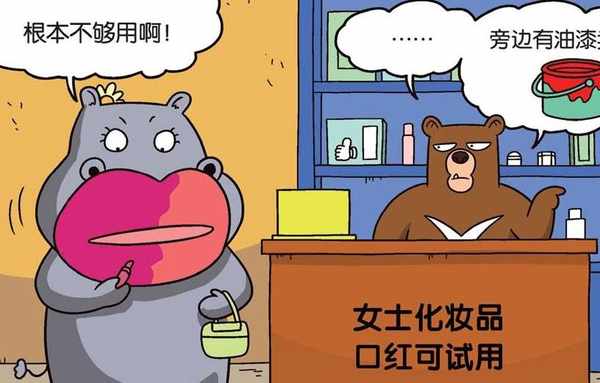 您看看用这么多了我的嘴唇还会没有涂满,生气的说:老板这个就有点坑人啦!还好可以试用不然我得要买多少口红,这个时候熊阿鲁不能再忍了河马大婶,我看您比较适合去隔壁店里买一桶红色油漆那个量大,再说了你嘴巴太大了。