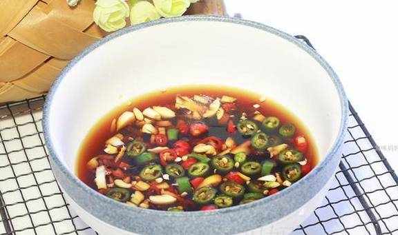 -我们利用蒸虾的时间准备酱料,调酱料需要一点小技巧。先清干净小米椒,线椒,然后切成圈,大蒜拍碎再剁碎备用。接着倒入适量的酱油,料酒,蚝油入碗,加入少许清水,然后搅拌均匀备用。