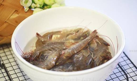 -我们在菜市场买回来的鲜活基围虾是打过氧,水质并不好,虾吸了不少脏东西,所以需要用清水浸泡,加入少许的盐和醋的效果更好,约10分钟,清水就变浅黄色了。