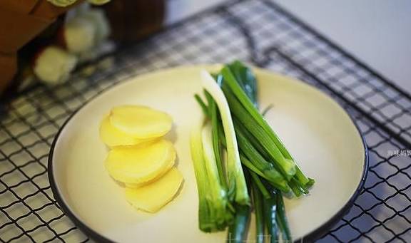 -准备小葱和姜片,小葱切成5厘米左右的长段,姜去皮切成片。姜片可去腥,小葱可增香,可备多一点,因为用到蒸锅,锅底装水放一部分,碗里放一部分。