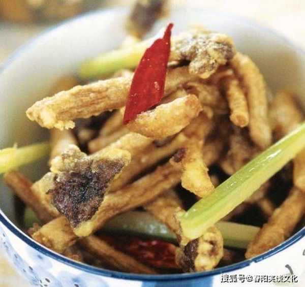 做法:1、锅内油烧热,放入用卤汁腌制好的茶树菇,肉条炒干水分,捞出沥油;