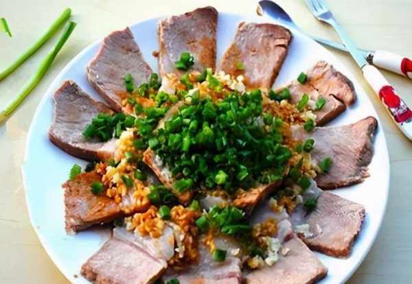 4.将肉切成薄片,放在盘子里。在肉片上撒上蒜末,再淋上酱油和少许盐。