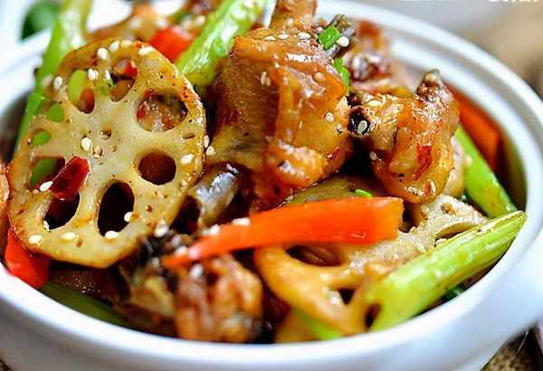 制法:将鸡肉洗净切块检查水分,加入料酒、胡椒粉、盐、姜片拌匀腌30分钟。莲藕去皮切成薄片,红辣椒切条,芹菜切块,葱切姜切片,蒜切丁,红辣椒洗净晒干。