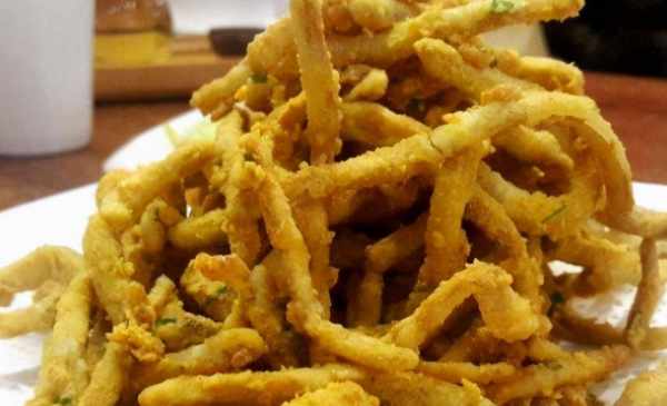 2、油锅烧热,将茶树菇放入油锅中,炸至金黄酥脆,取出查油待用。