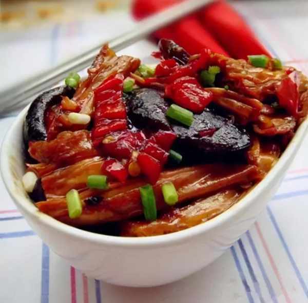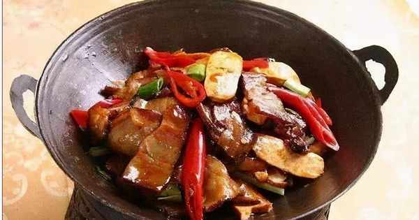 原料:干香精和腊肉、盐2克、味精1克、黄豆酱油2克、四川豆瓣5克、姜末、蒜末3克、蒜段2克、鲜15克红辣椒段、干辣椒段5克、茶油20克、高汤300克。