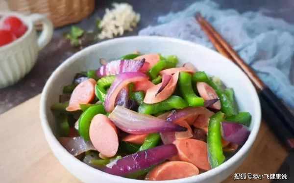做法:1、紫洋葱一个、辣椒粉一个、火腿肠两根。洋葱切条,辣椒去蒂去籽切长条,火腿肠用斜刀片切;