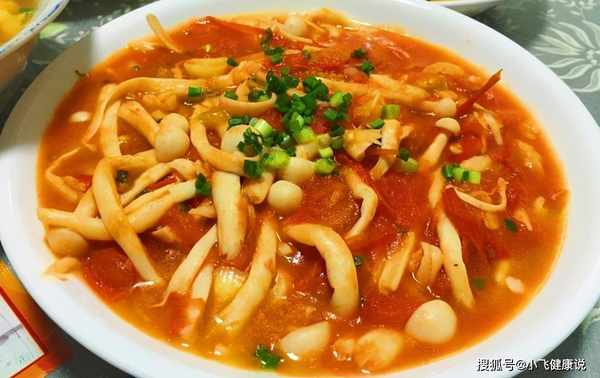 材料:西红柿两个、海鲜菇适量、小葱两根、蒜两瓣、油、盐、糖