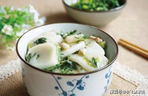 2.年糕块用清水冲洗干净,掰开,然后用开水烫1分钟,立即捞出待用;3、热锅倒入油,姜末爆香,下入年糕翻炒,出锅前加入荠菜末、盐一勺、香油一勺调味。