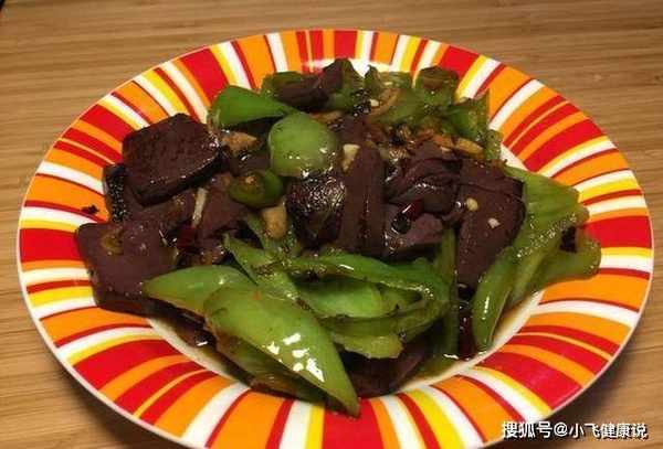 材料:猪血1块,青椒适量,盐和料酒少许,蒜末适量