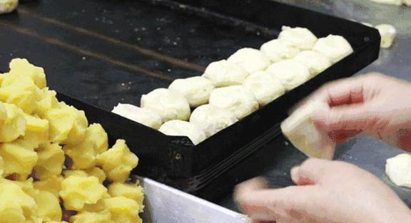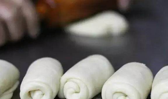 两种不同的面团按比例揉在一起,先擀一遍对折后再擀,重复3次,之后再卷起来,放在一旁,准备包内陷。“水与油不相容,面团烤出来后,饼皮才会有12层。”