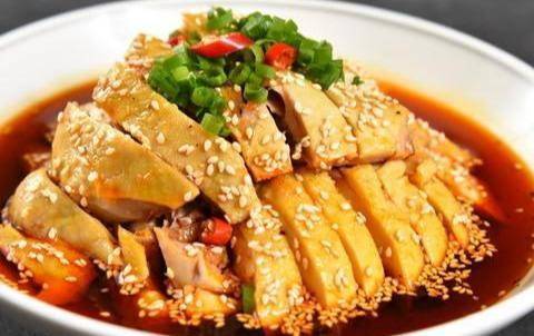 材料:鸡腿、料酒、葱姜、花生、麻辣油、酱油、白醋、糖、盐、芝麻