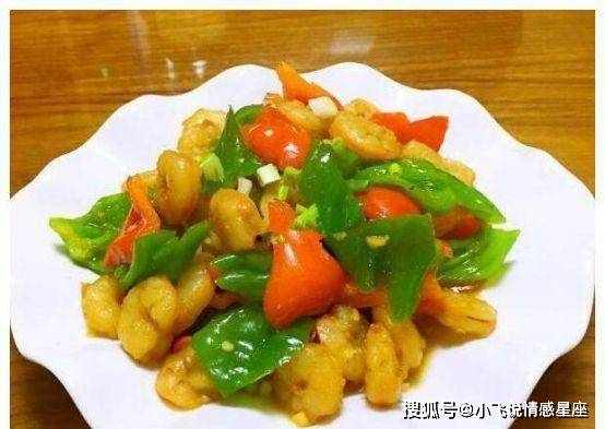 2、将青红椒放入旺火翻炒片刻,加盐,再放入大虾翻炒几分钟即可出锅。