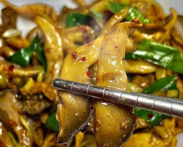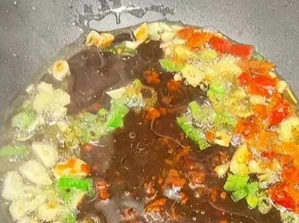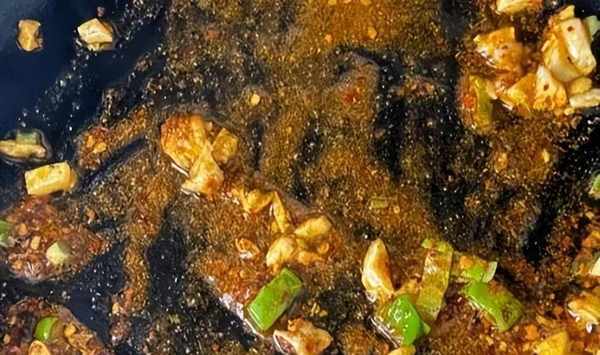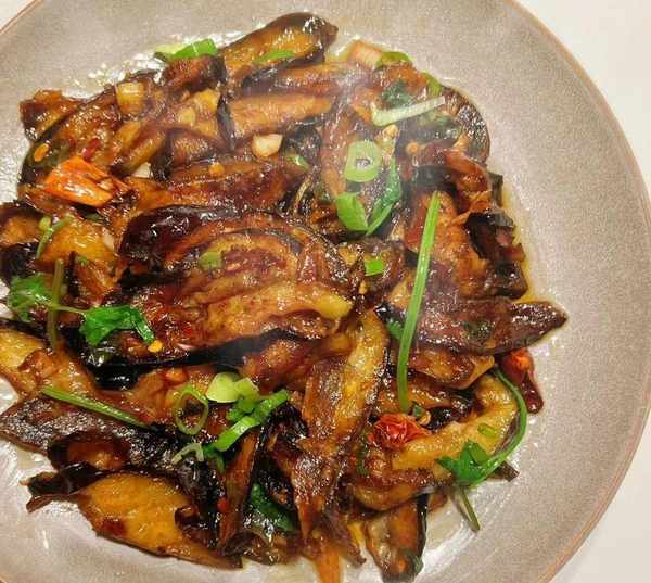 第四步,锅里留底油,炒香葱蒜干辣椒。倒入料汁,等到料汁起泡泡时,放入茄子快速翻炒几下。