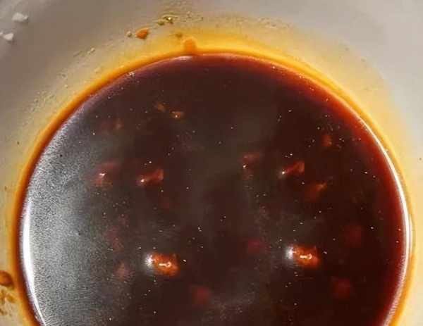 第二步,准备调味汁:一勺生抽,半勺老抽,半勺辣豆瓣酱油,半勺糖,半勺醋,搅匀备用。
