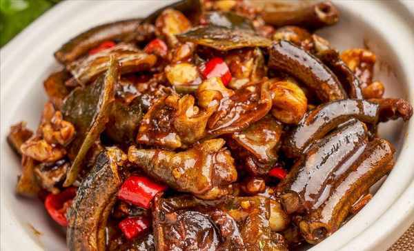 2、起锅烧油,把黄鳝放进去,直至黄鳝变色并且卷曲后,出锅。留底油,爆香葱姜后,重新倒入黄鳝,加上适量的料酒去腥,炒匀后再用生抽、老抽、白糖调味,加上少许温水,盖盖焖煮5分钟。最后加上盐、鸡精、一点点香醋调味后,炒匀出锅。