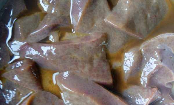 准备新鲜的猪肝,用淡盐水浸泡约30分钟,然后取出在水龙头下冲洗,最后切成片。