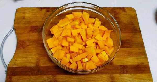 第一步:将南瓜去皮去籽,洗净切块小丁,然后将切好的南瓜放入豆浆机中,加入适量的水,按下浓汤键。