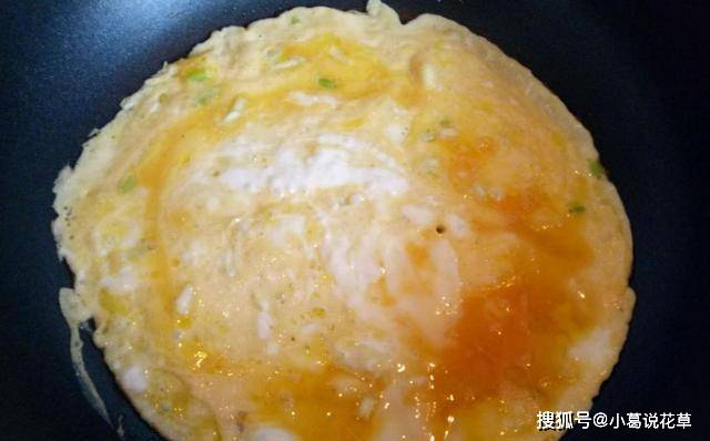 第三步:鸡蛋打入适量盐,锅烧热,加入适量油,油热后倒入蛋液,切成鸡蛋饼迅速摊开,炸成小块,放入它们出来以备后用。